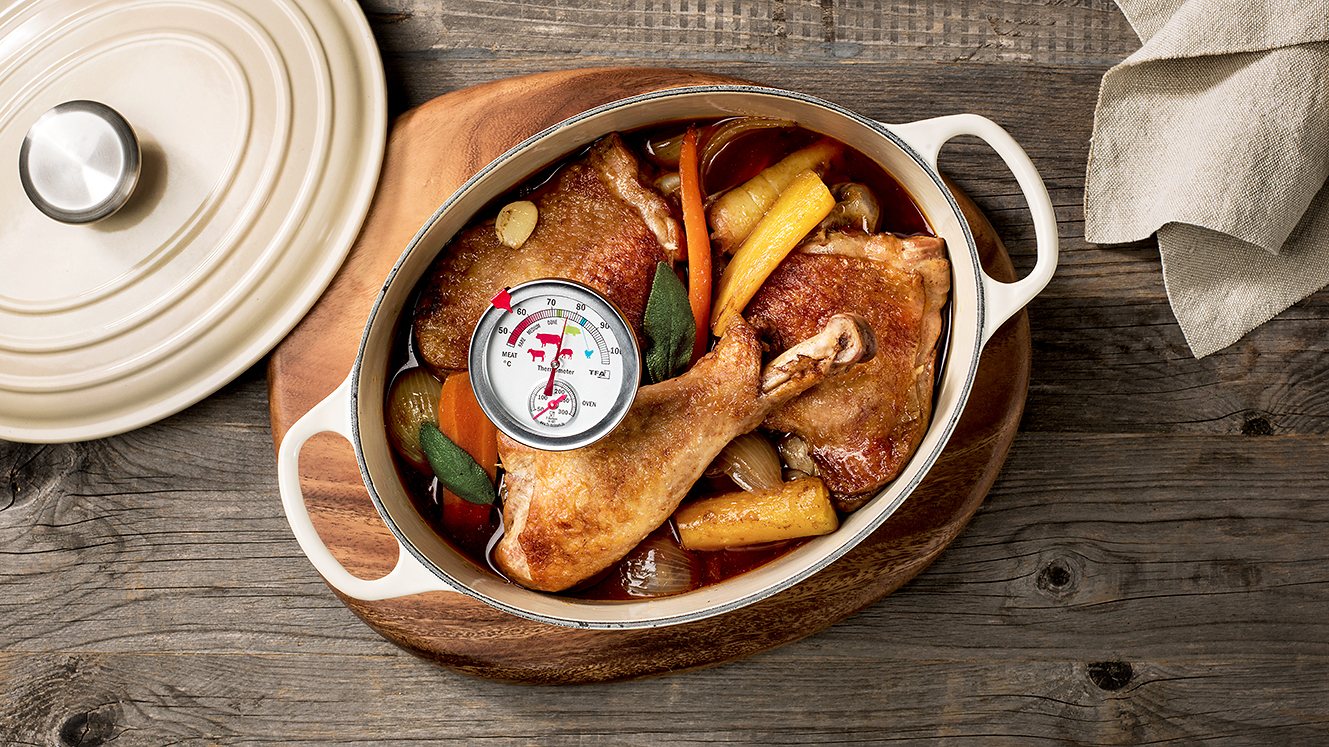 Das Fleisch darf nicht zu kurz, aber auch nicht zu lange geschmort werden. Ein Kilo Schopf beispielsweise muss bei 180 °C etwa zwei Stunden garen, damit er zum zart-knusprigen Schweinsbraten wird. Bei Fleischstücken sticht man am besten mit einer Gabel ein Stück an. Zerfällt es leicht, dann ist das Ragout fertig. Bei ganzen Stücken ist allerdings, wie so oft, ein Bratenthermometer super hilfreich: Je nach Fleischsorte soll die Kerntemperatur zwischen 70 und 85 °C liegen.